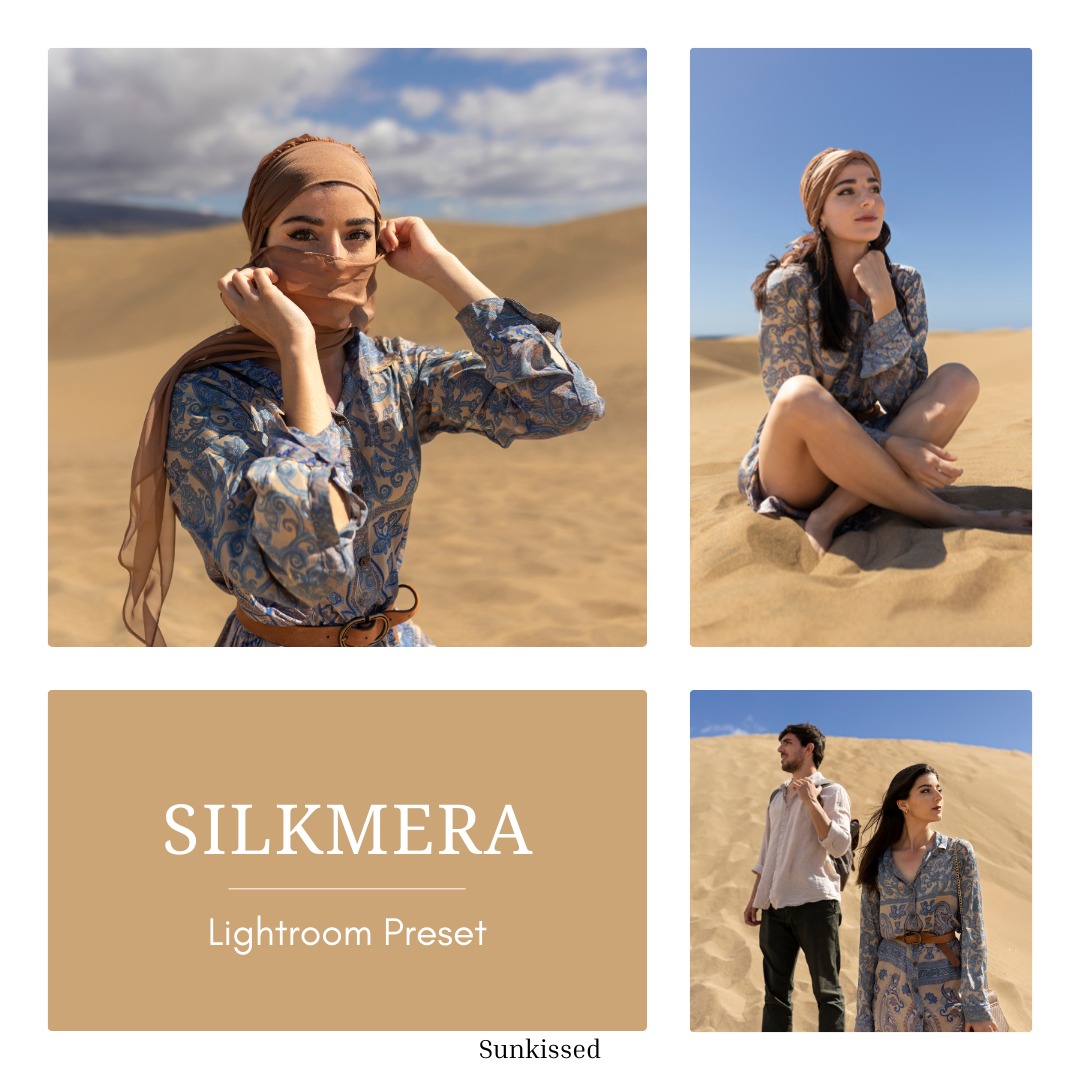 Silkmera is made for sun-drenched locations—desert, beach, and bright travel scenes—where you want warm, elegant neutrals and clean, confident blues. The 5-preset pack gives you a complete range: lighter airy options for midday, balanced edits for consistent skin, and deeper cinematic variants for stronger atmosphere and contrast.